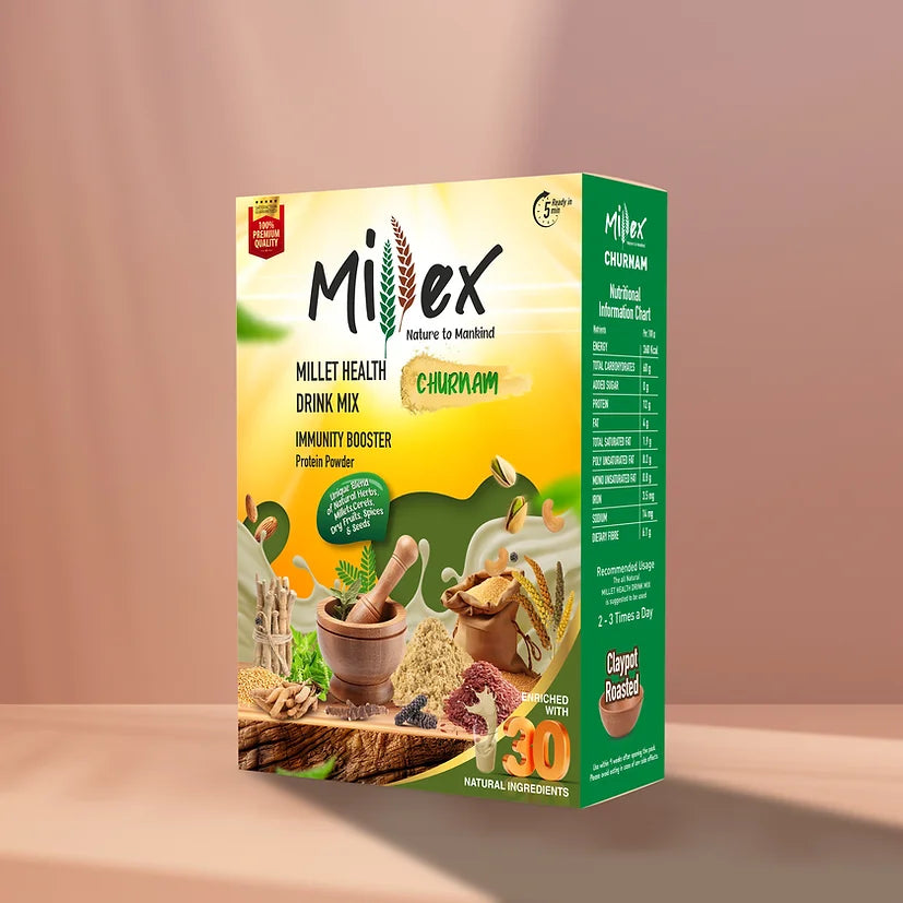 Millex Healthy Millet Mix is a traditional blend of 30 varieties of natural ingredients including millets, cereals, pulses, dry fruits, nuts, seeds, and spices. It contains 18 important Ayurvedic herbs like Ashwagandha, Shatavari, Gokshura, Jeshtamadhu, Hippali, etc., making it the most nutritious and healthy drink.